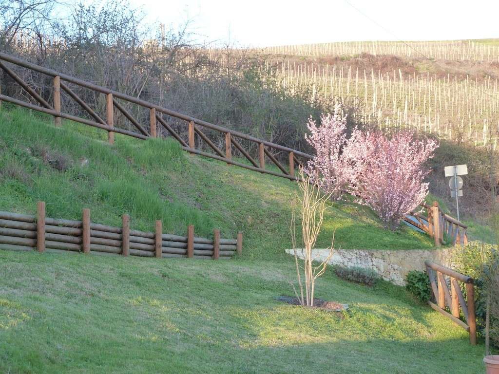 Dal giardino collinare , dalla parte alta pianeggiante , perfetta per l'inserimento di una grande piscina essendo assolata , si gode il panorama sulle vigne circostanti ed il prospicente Real castello dei Savoia di Govone , uno dei 7 castelli reali d'Italia.