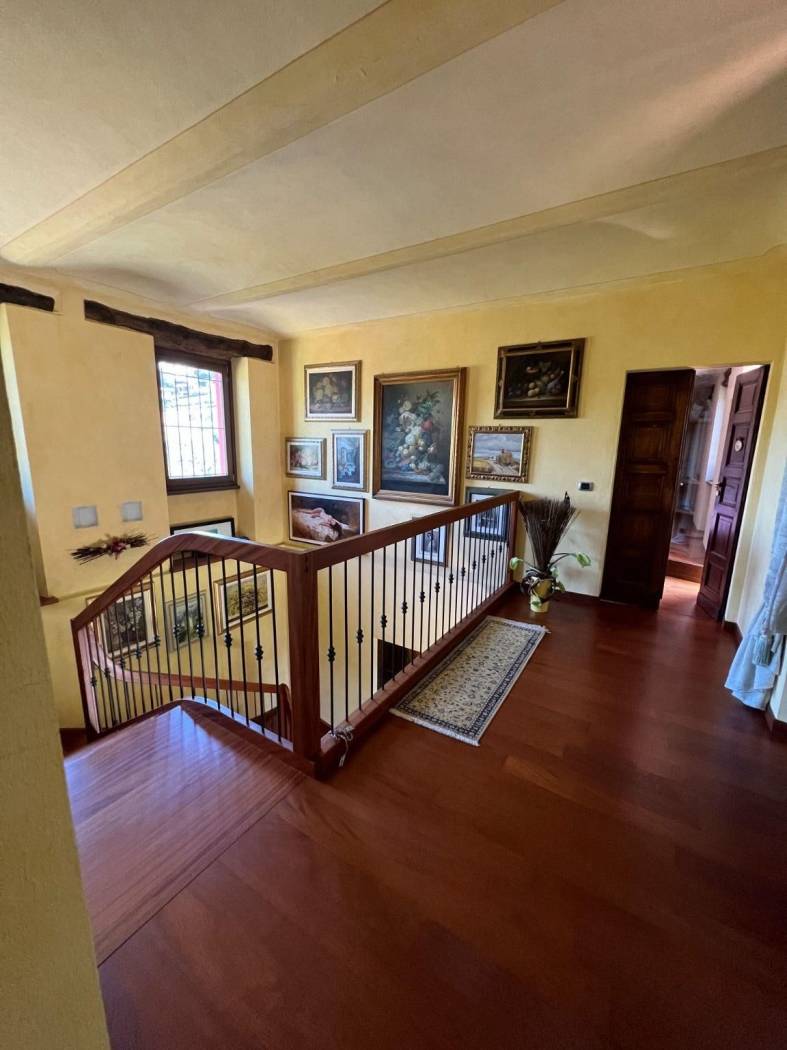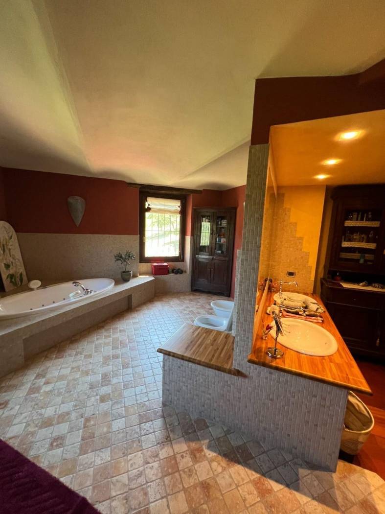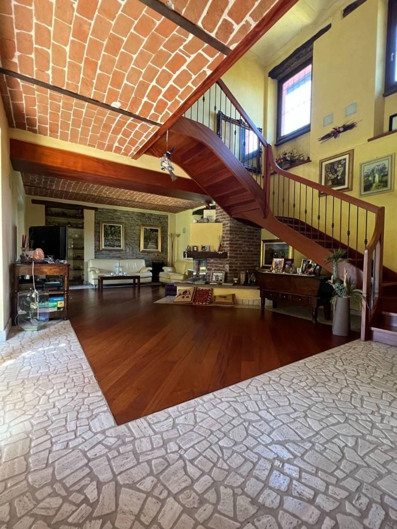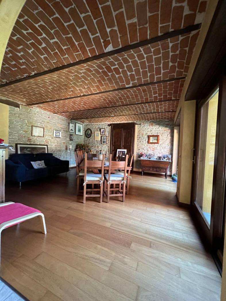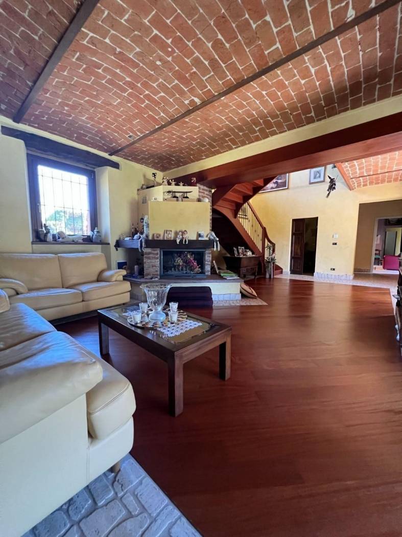 Il cuore pulsante della casa è rappresentato dall'ampio salone, caratterizzato da un centrale camino in pietra che crea un'atmosfera calda e accogliente nelle serate più fresche. Gli spazi sono arredati con mobili su misura che si integrano perfettamente con l'atmosfera rustica e lussuosa della cascina, porte in legno massiccio, pavimenti in parquet, rifiniture in pietra di Langa e mattoni vecchi danno all'immobile uno stile senza tempo.